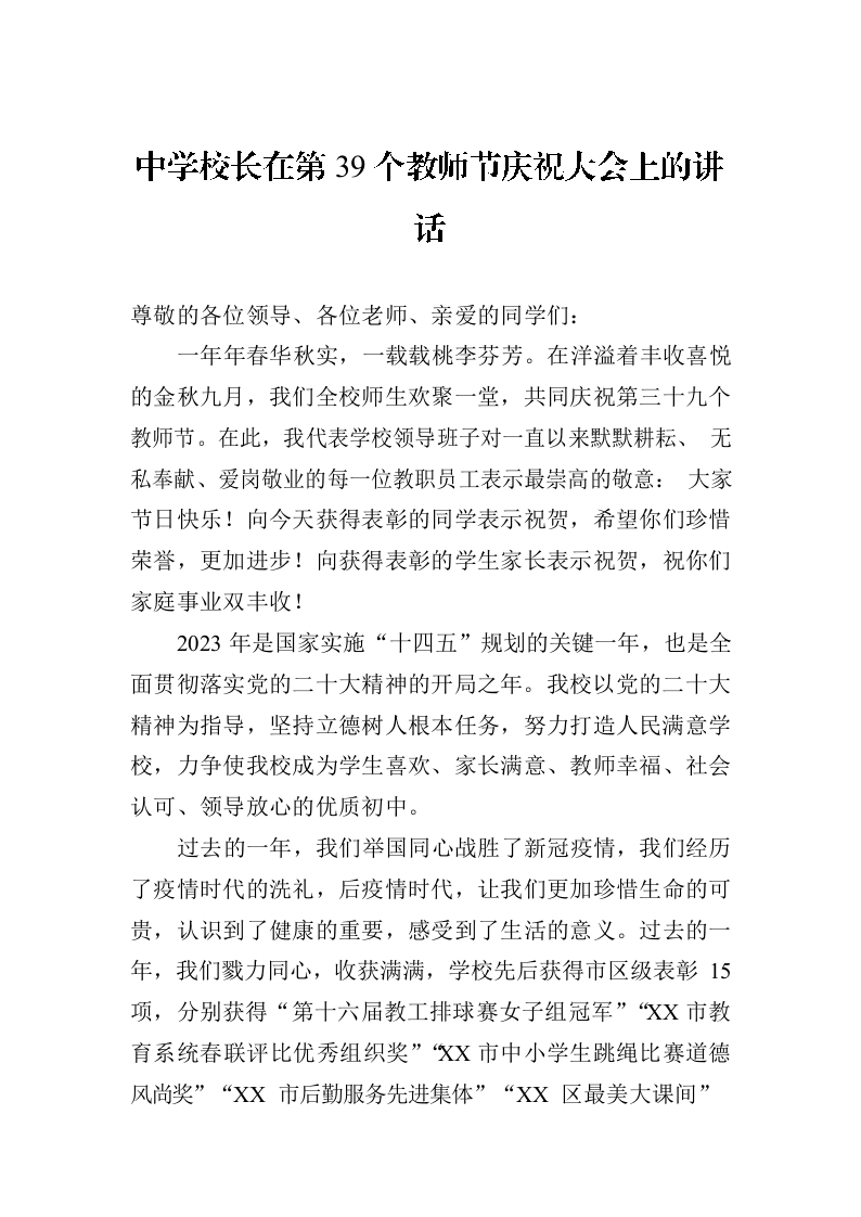 / 中学校长在第39个教师节庆祝大会上的讲话