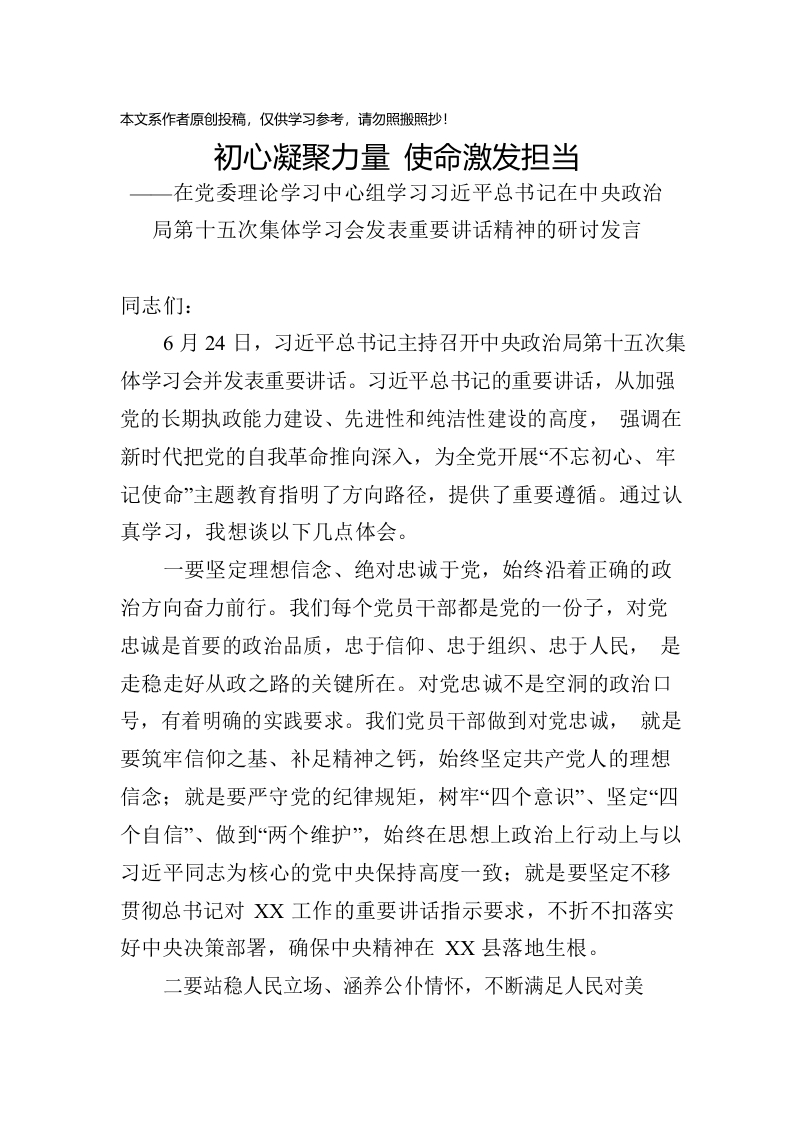 中心组学习习近平总书记在中央政治局第十五次集体学习会发表重要讲话精神的研讨发言