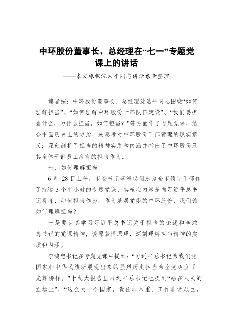 / 中环股份董事长、总经理在“七一”专题党课上的讲话