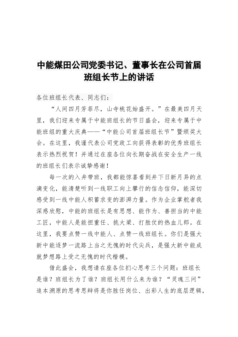 中能煤田公司党委书记、董事长在公司首届班组长节上的讲话