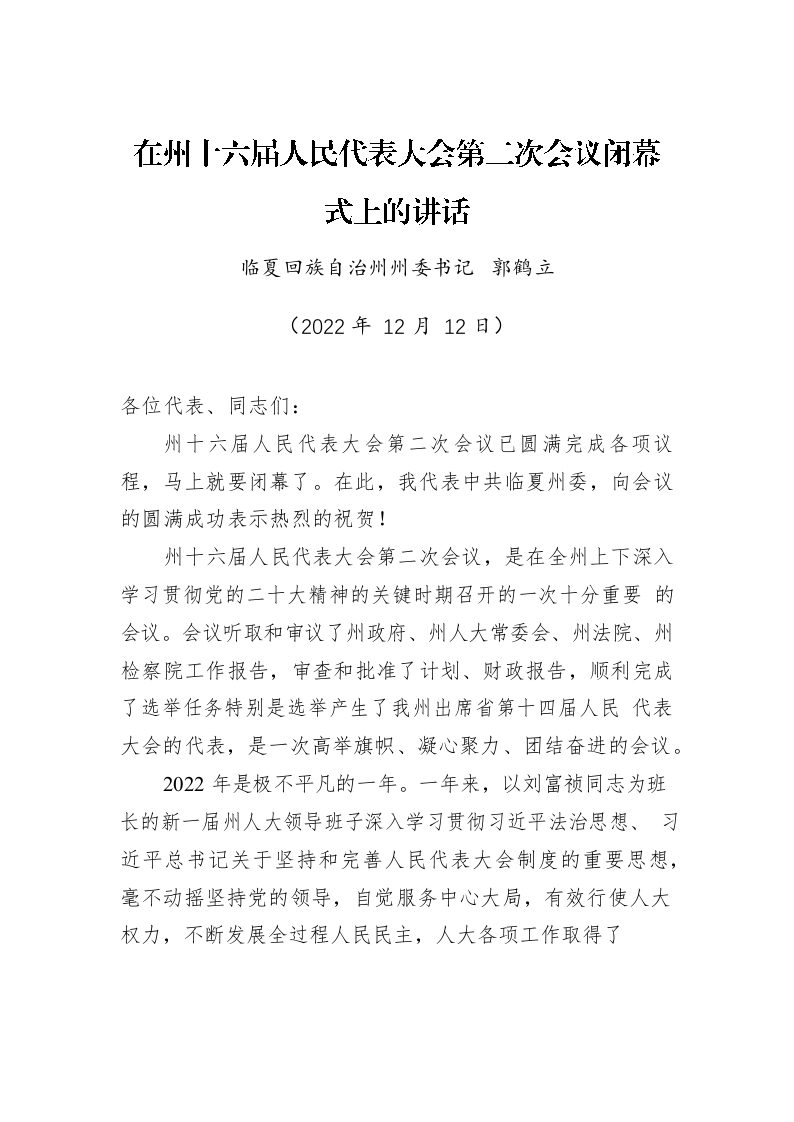 临夏回族自治州州委书记郭鹤立:在州十六届人民代表大会第二次会议闭幕式上的讲话(20221212)