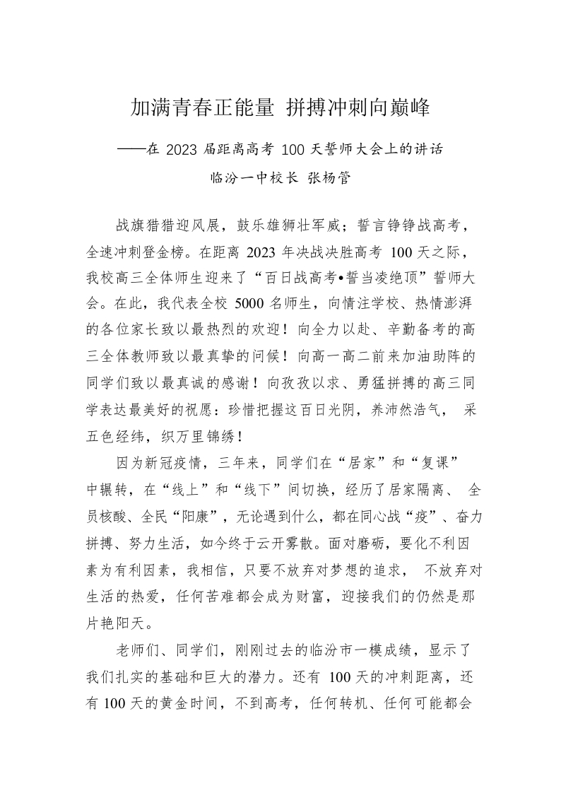 / 临汾一中校长张杨管:在2023届距离高考100天誓师大会上的讲话
