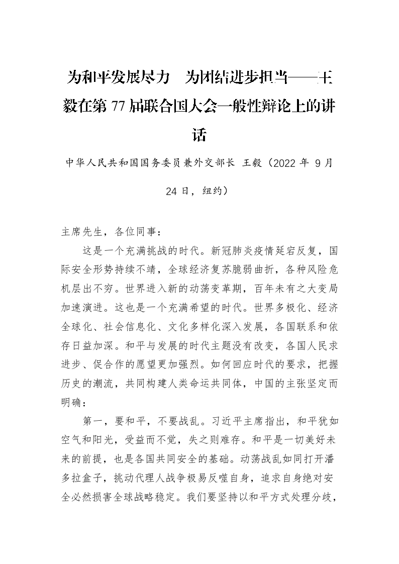 / 为和平发展尽力 为团结进步担当——王毅在第77届联合国大会一般性辩论上的讲话