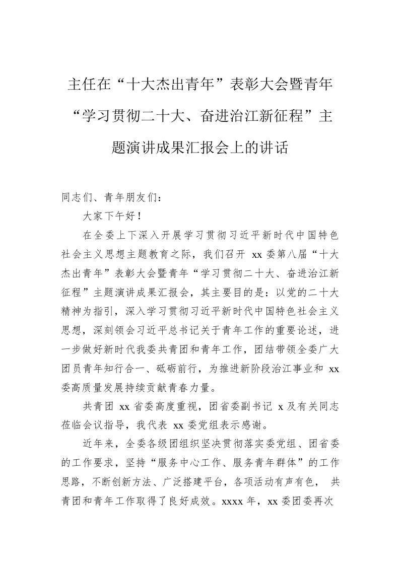主任在“十大杰出青年”表彰大会暨青年“学习贯彻二十大、奋进治江新征程”主题演讲成果汇报会上的讲话