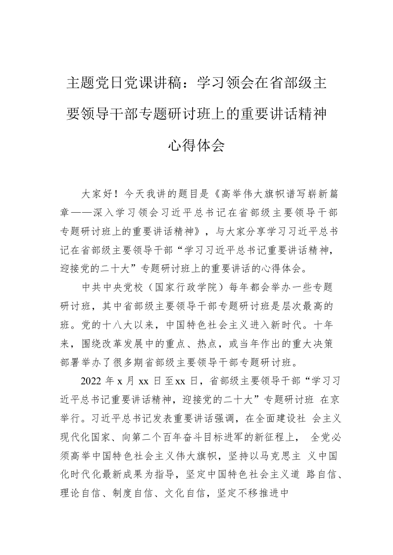 / 主题党日党课讲稿:学习领会在省部级主要领导干部专题研讨班上的重要讲话精神心得体会
