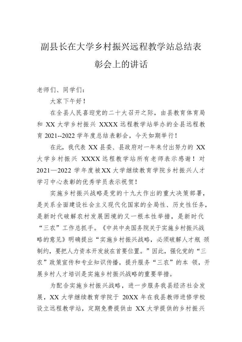 / 副县长在大学乡村振兴远程教学站总结表彰会上的讲话