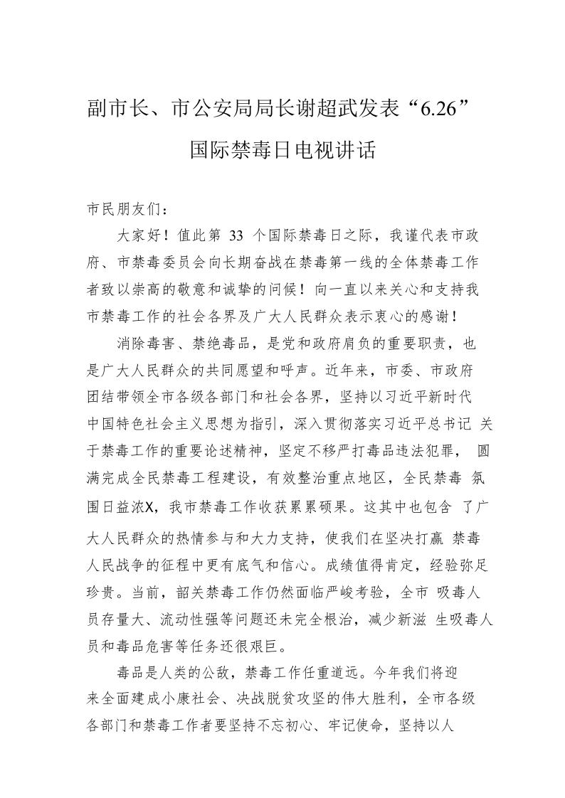 / 副市长、市公安局局长谢超武发表“6.26”国际禁毒日电视讲话