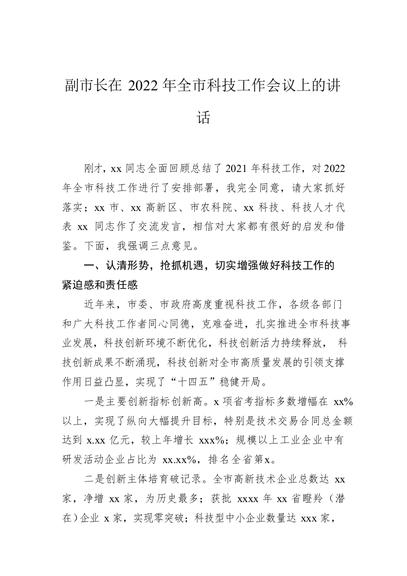 / 副市长在2022年全市科技工作会议上的讲话