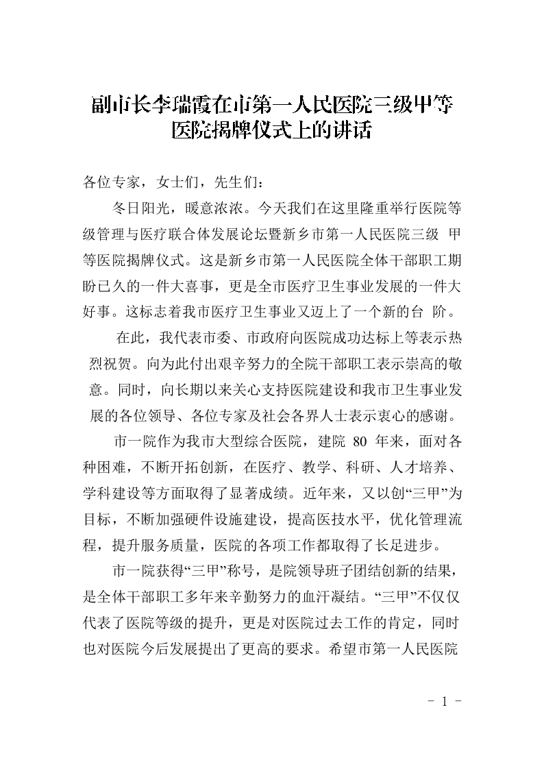 副市长李瑞霞在市第一人民医院三级甲等医院揭牌仪式上的讲话