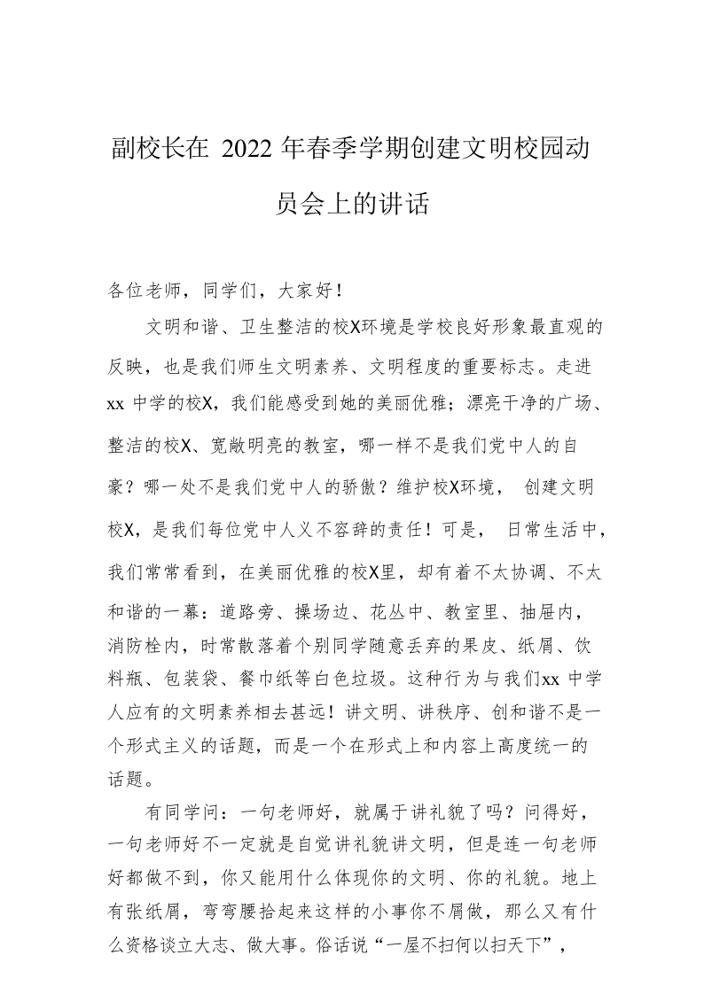 副校长在2022年春季学期创建文明校园动员会上的讲话