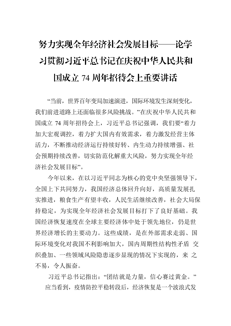 / 努力实现全年经济社会发展目标——论学习贯彻习近平总书记在庆祝中华人民共和国成立74周年招待会上重要讲话