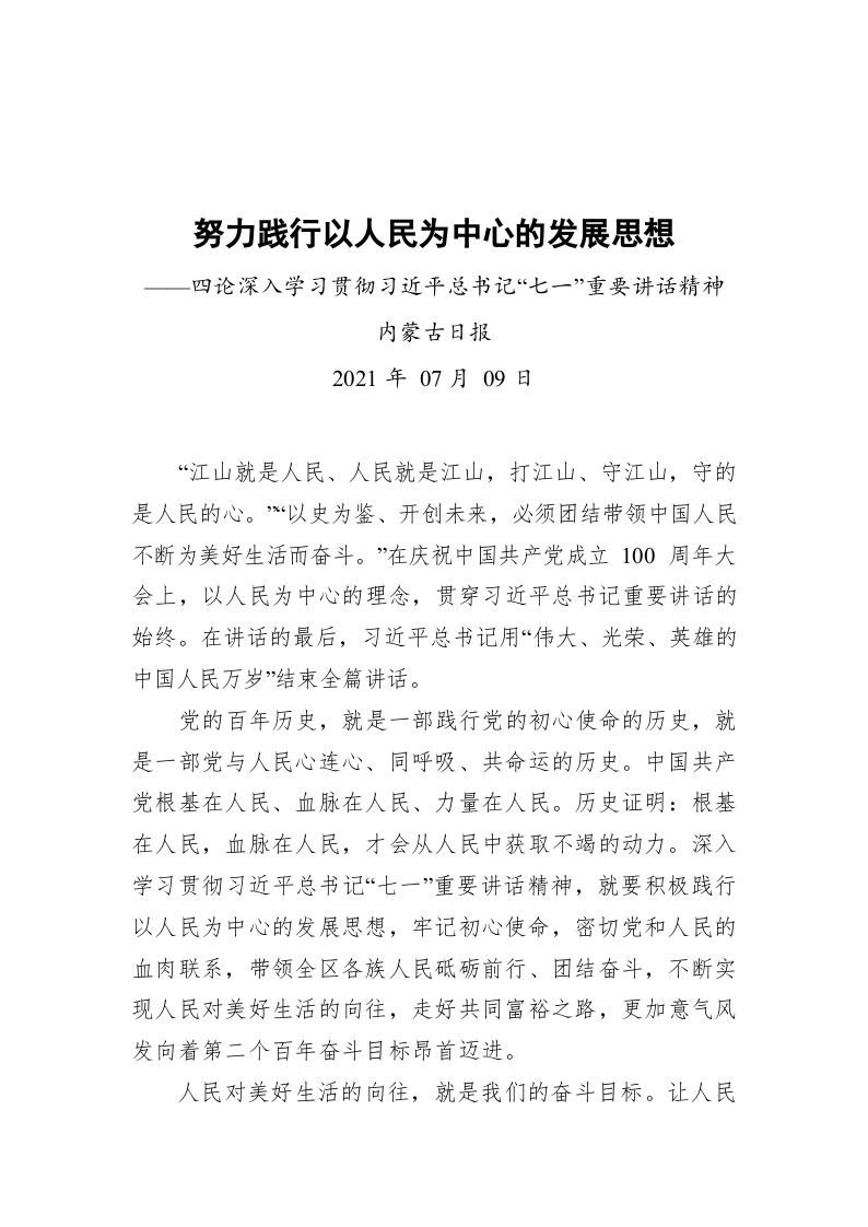 / 努力践行以人民为中心的发展思想——四论深入学习贯彻习近平总书记“七一”重要讲话精神