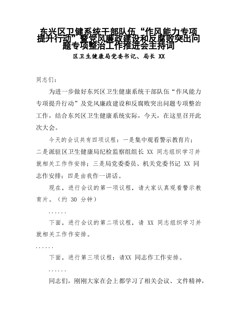 / 区卫健系统干部队伍作风能力提升行动推进会主持词及强调讲话