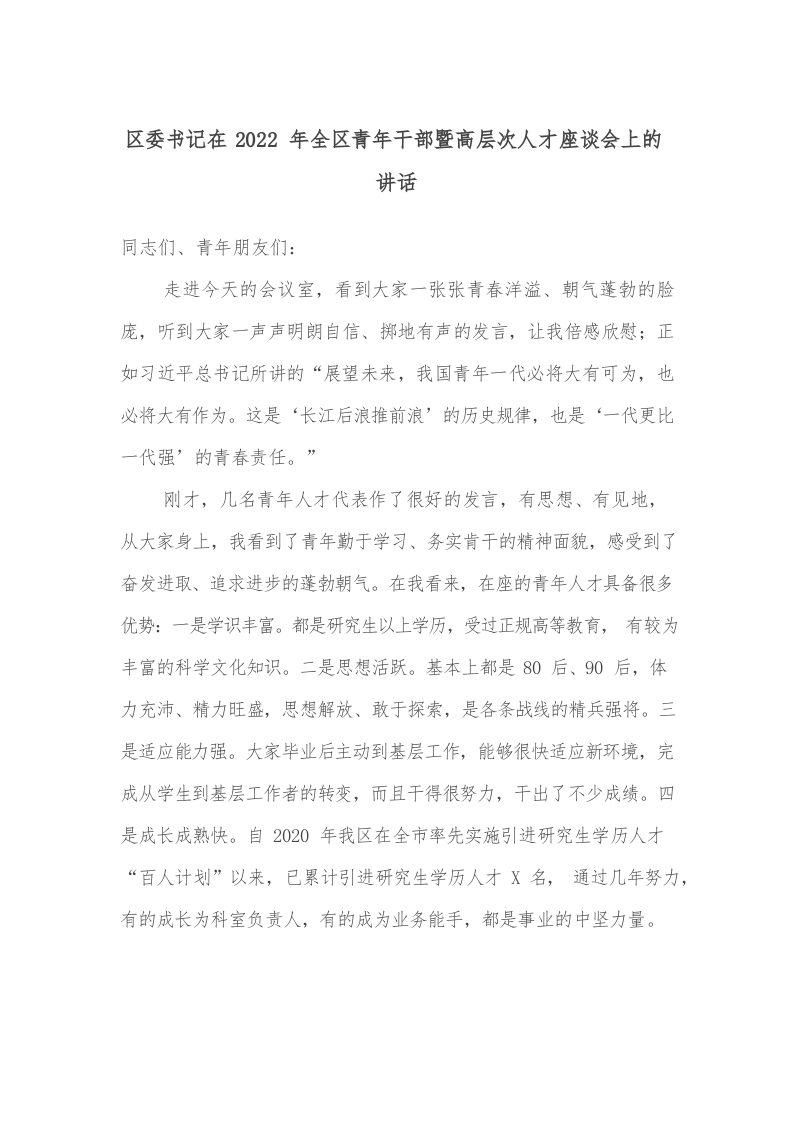 / 区委书记在2022年全区青年干部暨高层次人才座谈会上的讲话