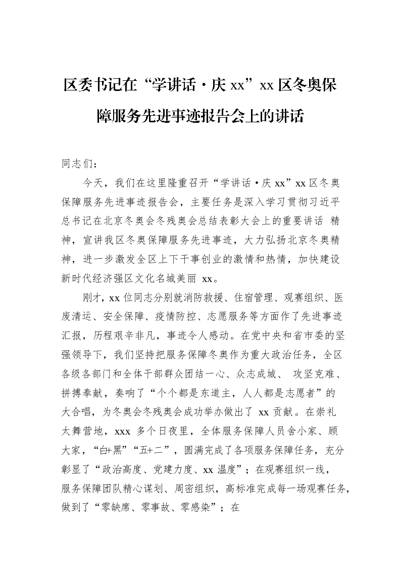 / 区委书记在“学讲话·庆xx”xx区冬奥保障服务先进事迹报告会上的讲话