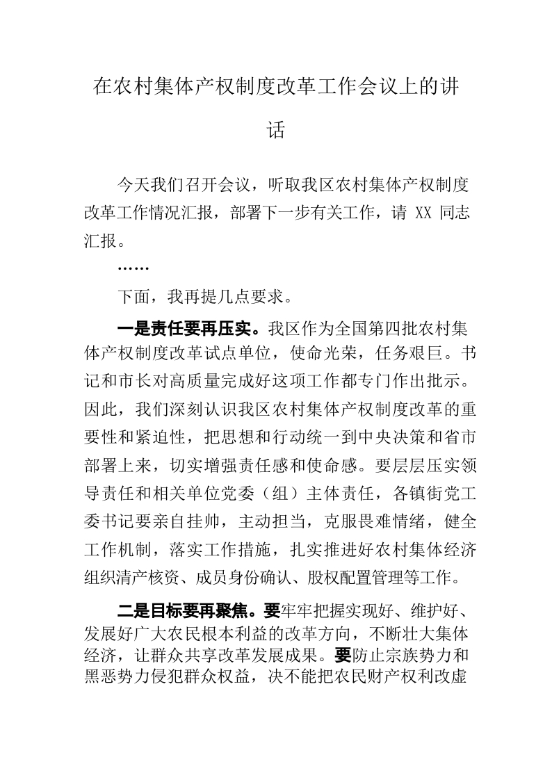 / 区委书记在农村集体产权制度改革工作会议上的讲话
