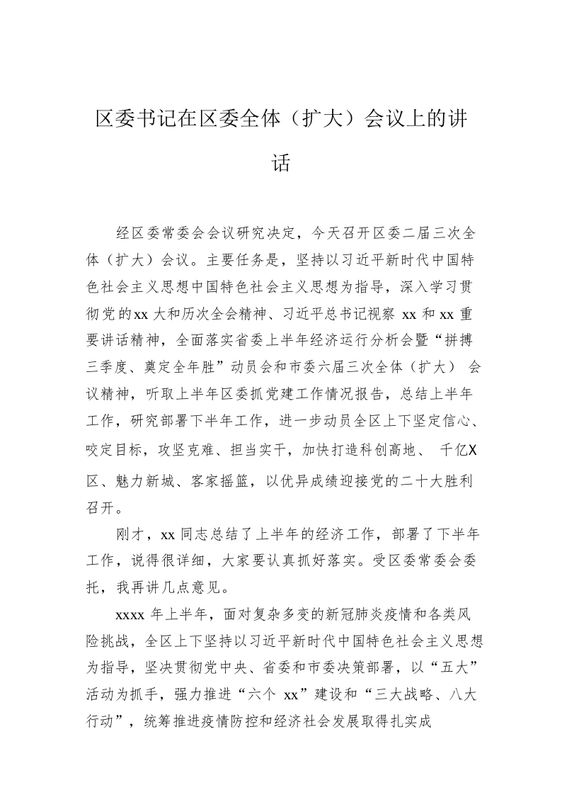 / 区委书记在区委全体(扩大)会议上的讲话