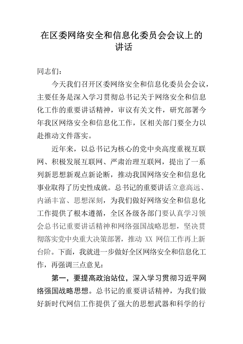 / 区委书记在区委网络安全和信息化委员会会议上的讲话