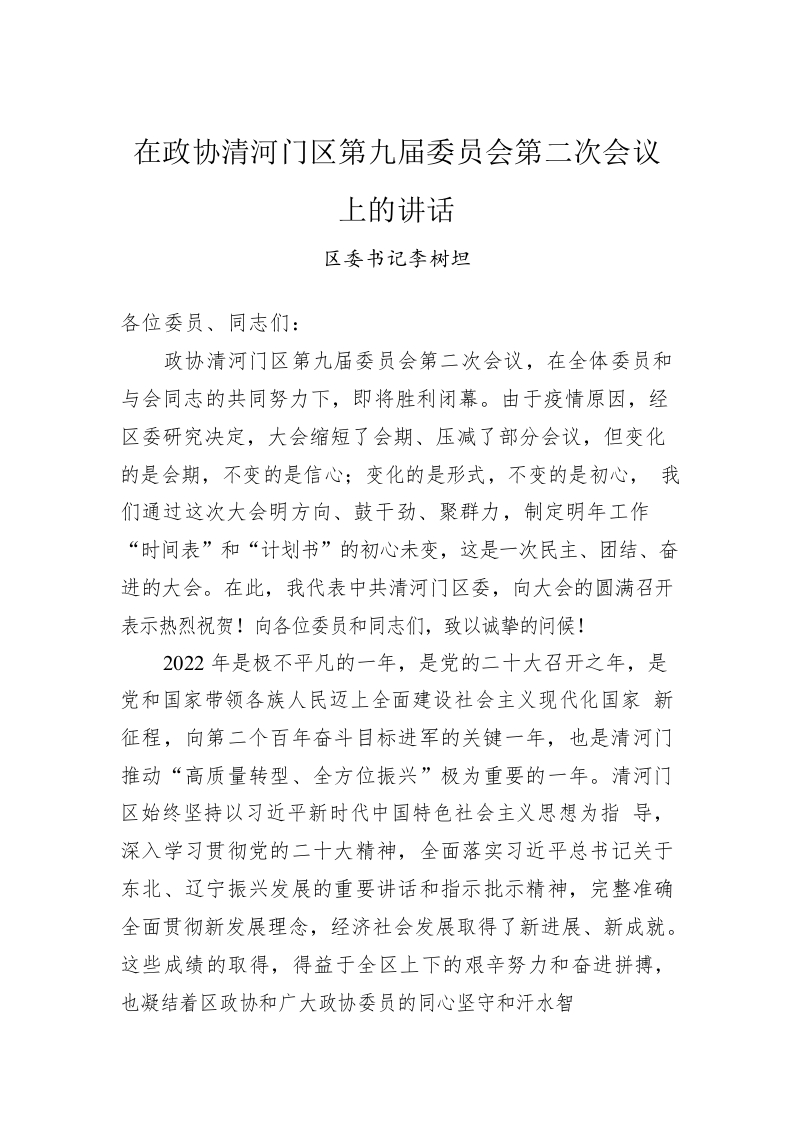 区委书记李树坦:在政协清河门区第九届委员会第二次会议上的讲话