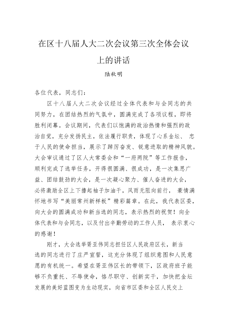 区委书记陆秋明陆秋明:在区十八届人大二次会议第三次全体会议上的讲话