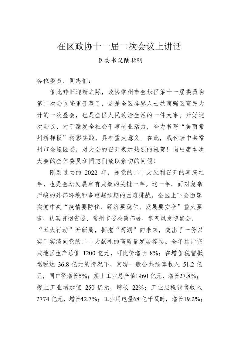区委书记陆秋明:在区政协十一届二次会议上讲话