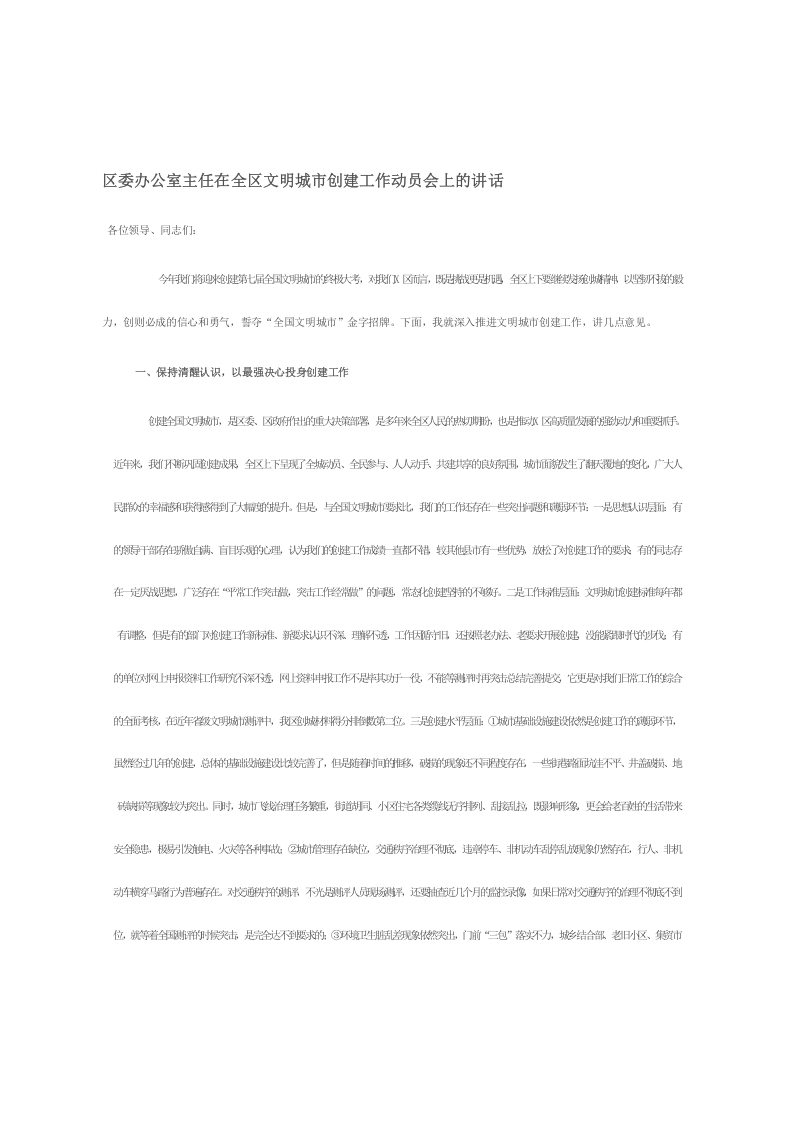 / 区委办公室主任在全区文明城市创建工作动员会上的讲话