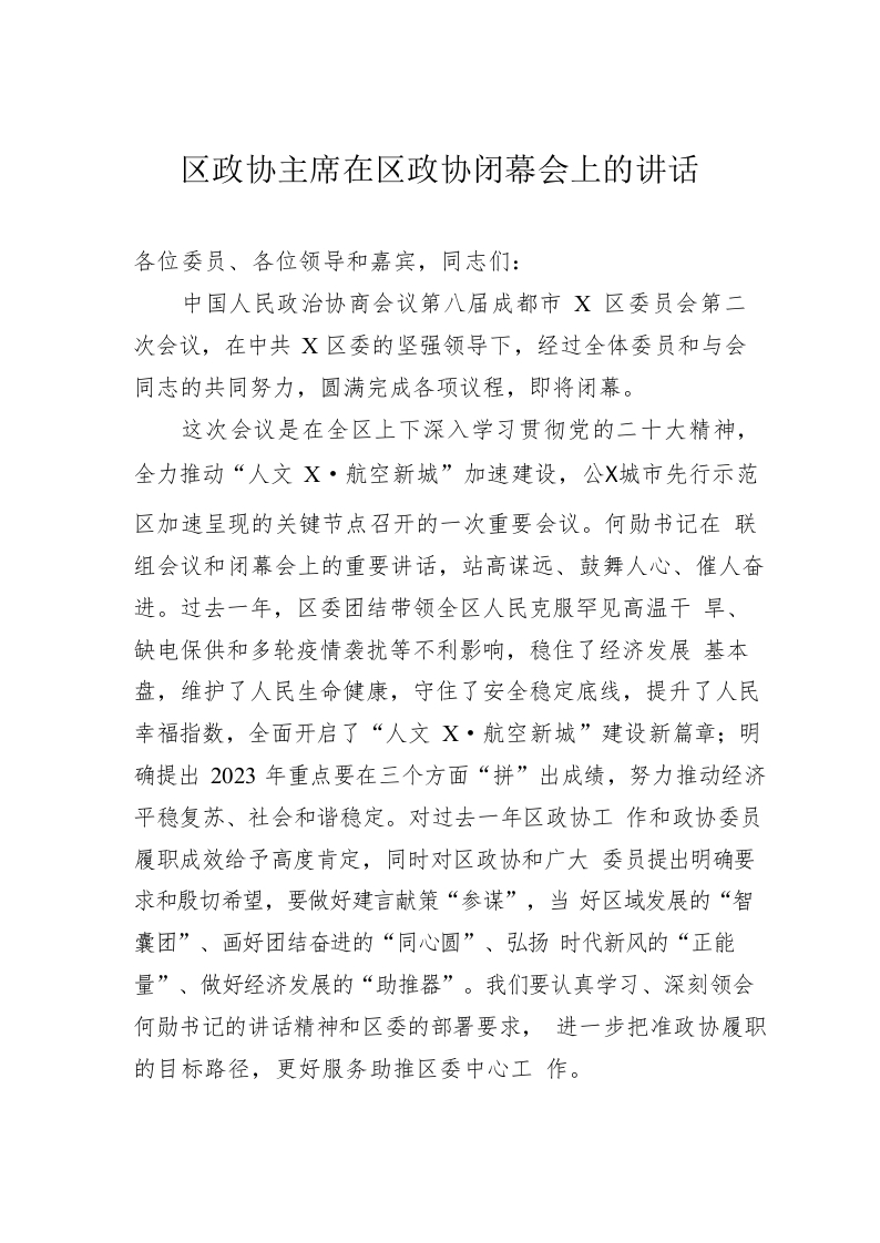 / 区政协主席在区政协闭幕会上的讲话