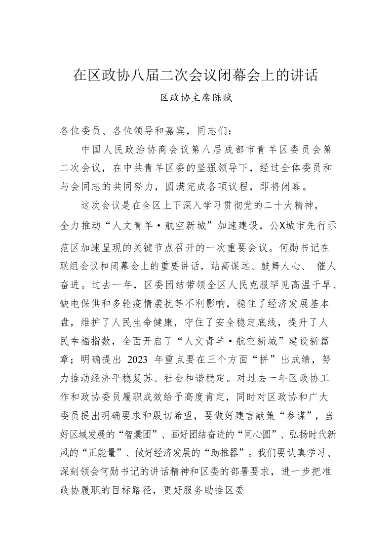 区政协主席陈赋:在区政协八届二次会议闭幕会上的讲话(20221227)