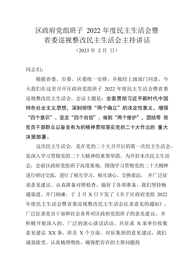 区政府党组班子2022年度民主生活会暨省委巡视整改民主生活会主持讲话