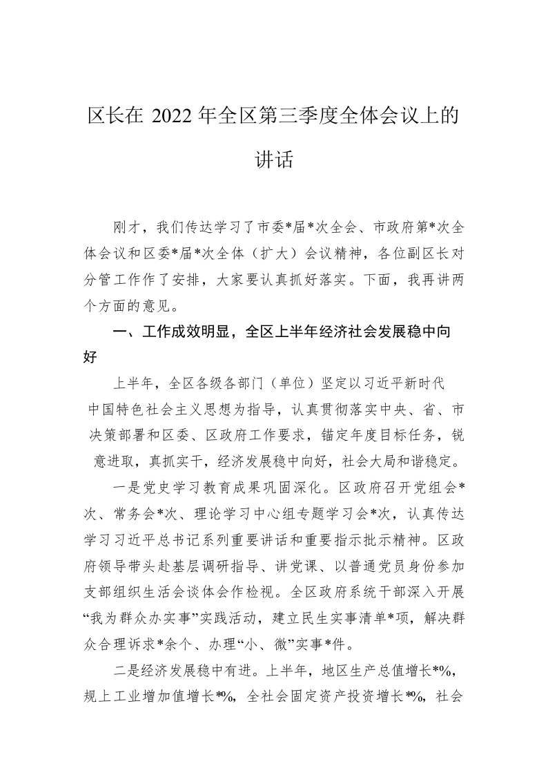/ 区长在2022年全区第三季度全体会议上的讲话