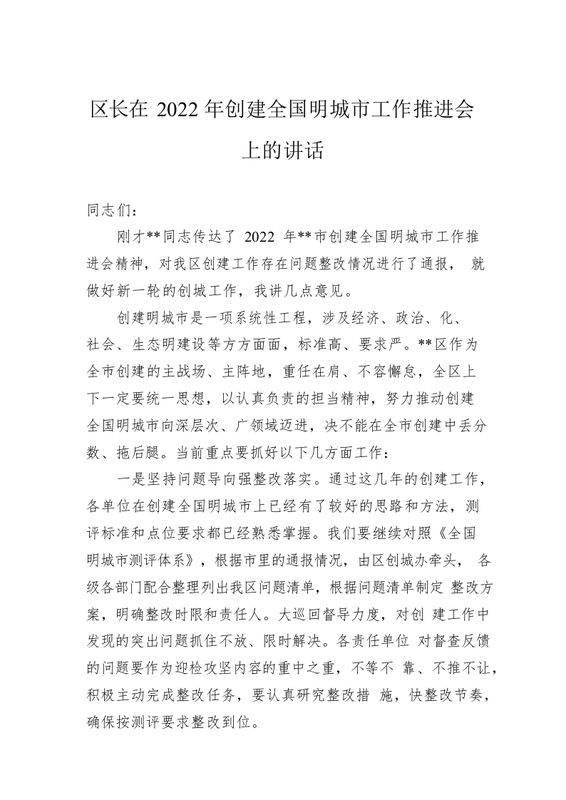 / 区长在2022年创建全国明城市工作推进会上的讲话