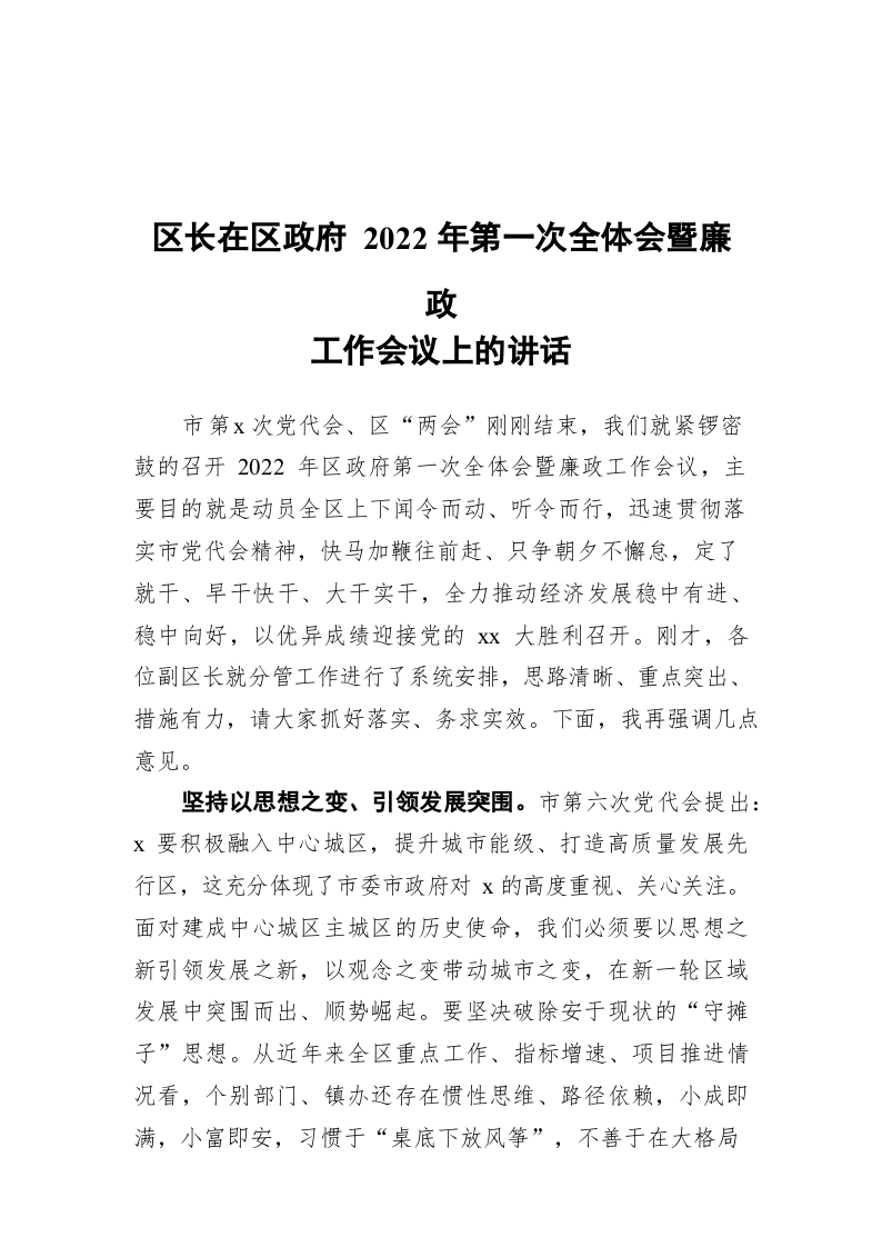/ 区长在区政府2022年第一次全体会暨廉政工作会议上的讲话