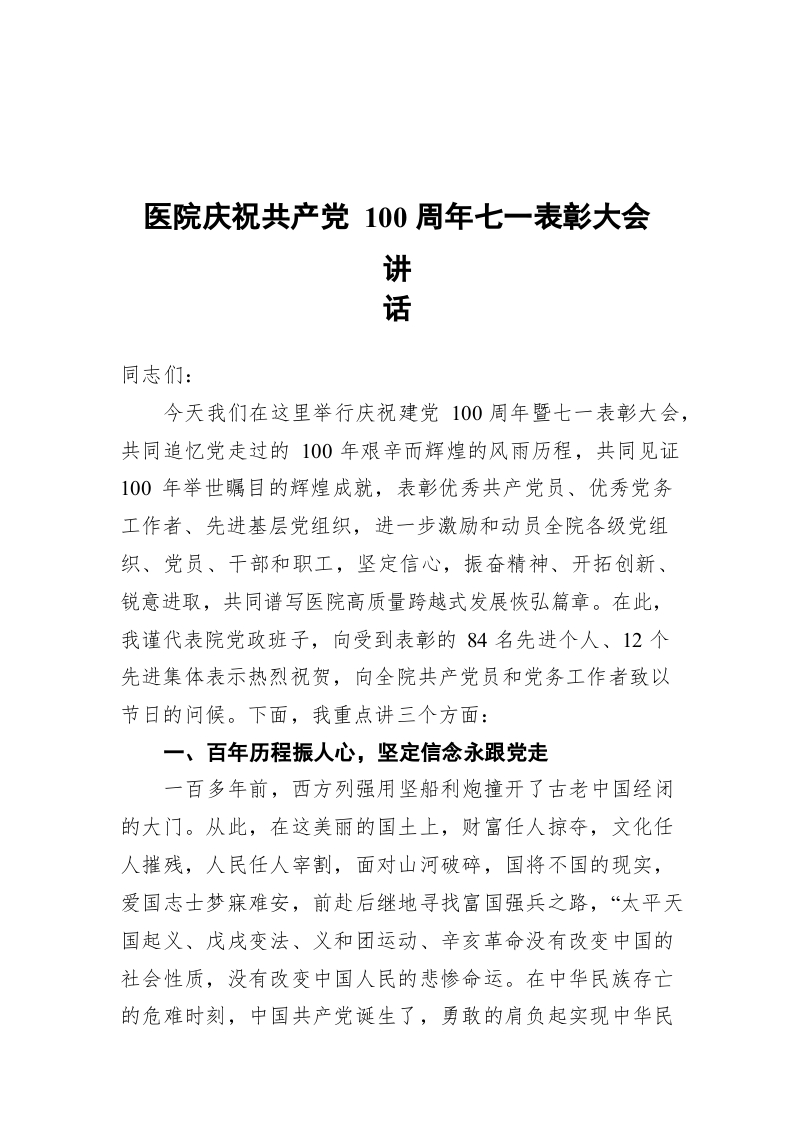 / 医院庆祝共产党100周年七一表彰大会讲话