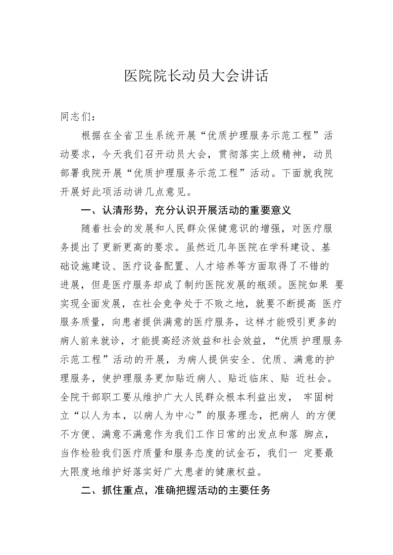 医院院长在“优质护理服务示范工程”活动动员大会上的讲话