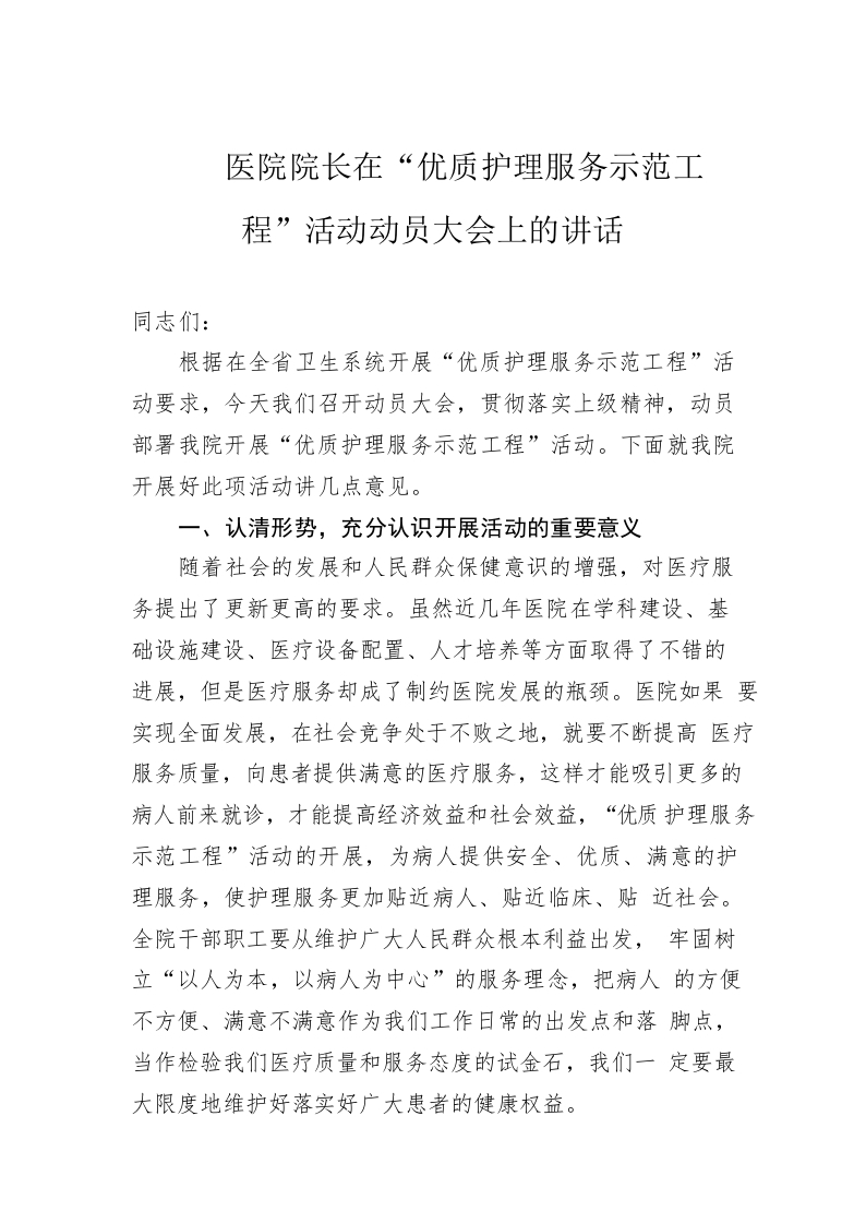 / 医院院长在“优质护理服务示范工程”活动动员大会上的讲话