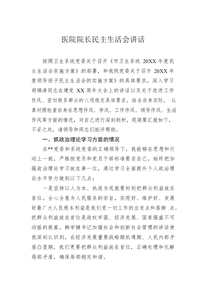 / 医院院长民主生活会讲话