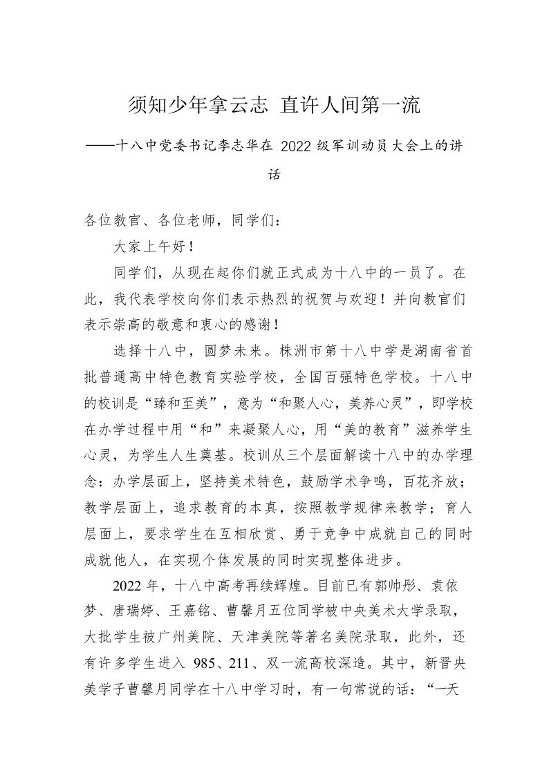 / 十八中党委书记李志华在2022级军训动员大会上的讲话(20220717)