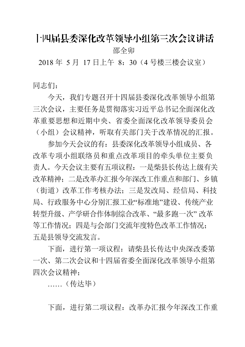 / 十四届县委深化改革领导小组第三次会议讲话