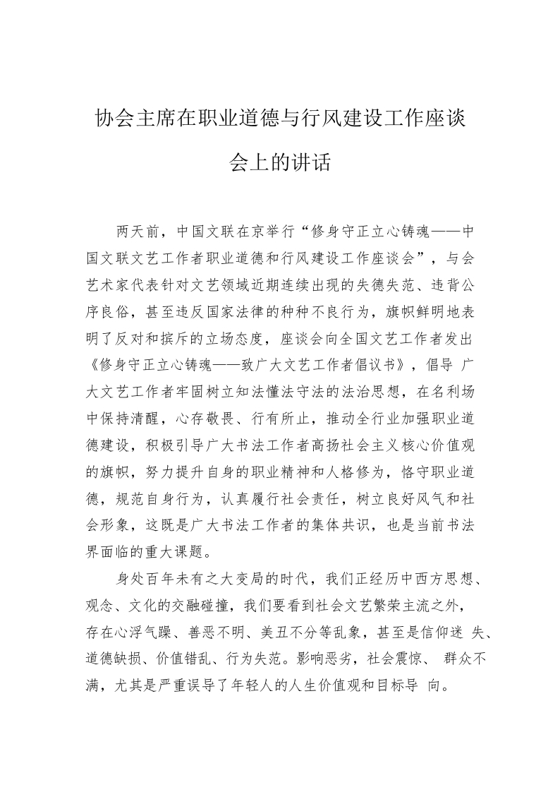 / 协会主席在职业道德与行风建设工作座谈会上的讲话