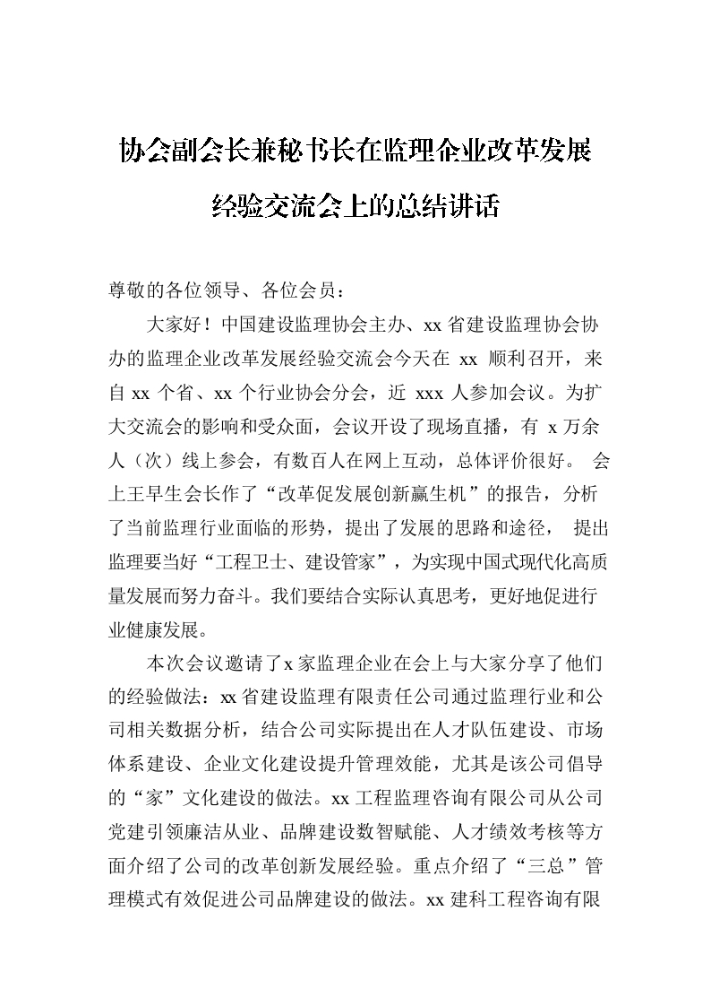 / 协会副会长兼秘书长在监理企业改革发展经验交流会上的总结讲话