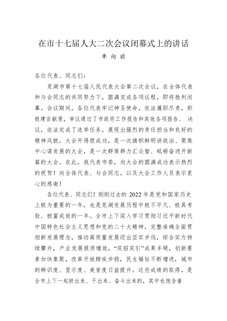 单向前:在市十七届人大二次会议闭幕式上的讲话(20230102)