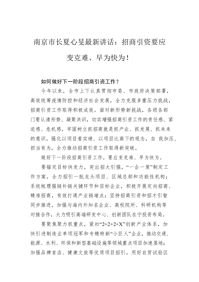 / 南京市长夏心旻最新讲话:招商引资要应变克难、早为快为!