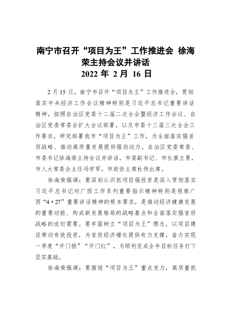 / 南宁市召开“项目为王”工作推进会 徐海荣主持会议并讲话(20220216)