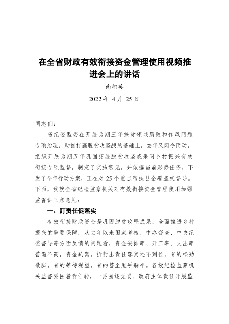 / 南积英:在全省财政有效衔接资金管理使用视频推进会上的讲话(20220425)