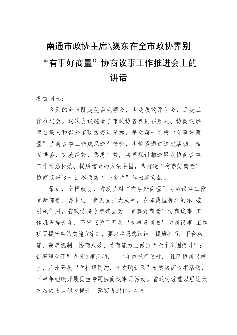 / 南通市政协主席黄巍东在全市政协界别“有事好商量”协商议事工作推进会上的讲话