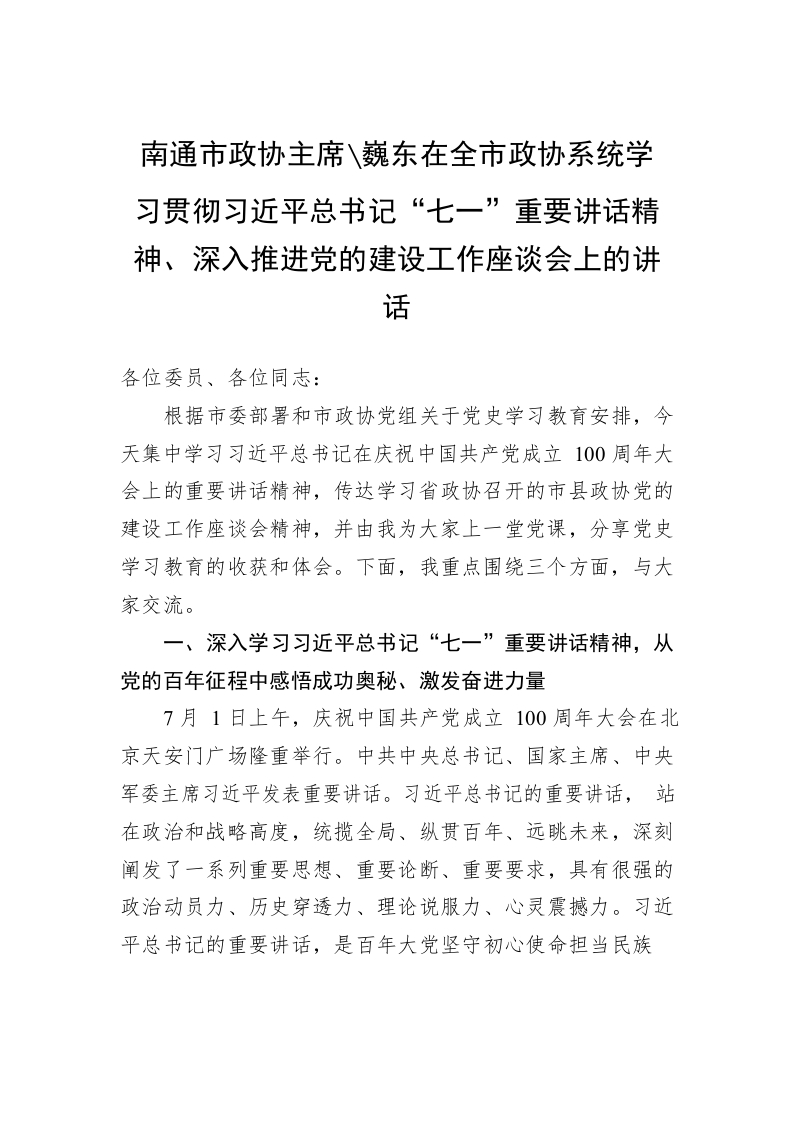 / 南通市政协主席黄巍东在全市政协系统学习贯彻习近平总书记“七一”重要讲话精神、深入推进党的建设工作座谈会上的讲话