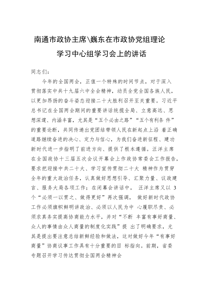 / 南通市政协主席黄巍东在市政协党组理论学习中心组学习会上的讲话(20220330)