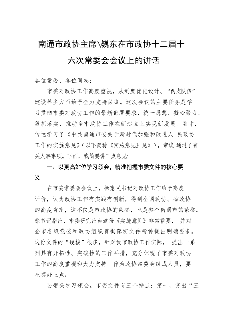 / 南通市政协主席黄巍东在市政协十二届十六次常委会会议上的讲话