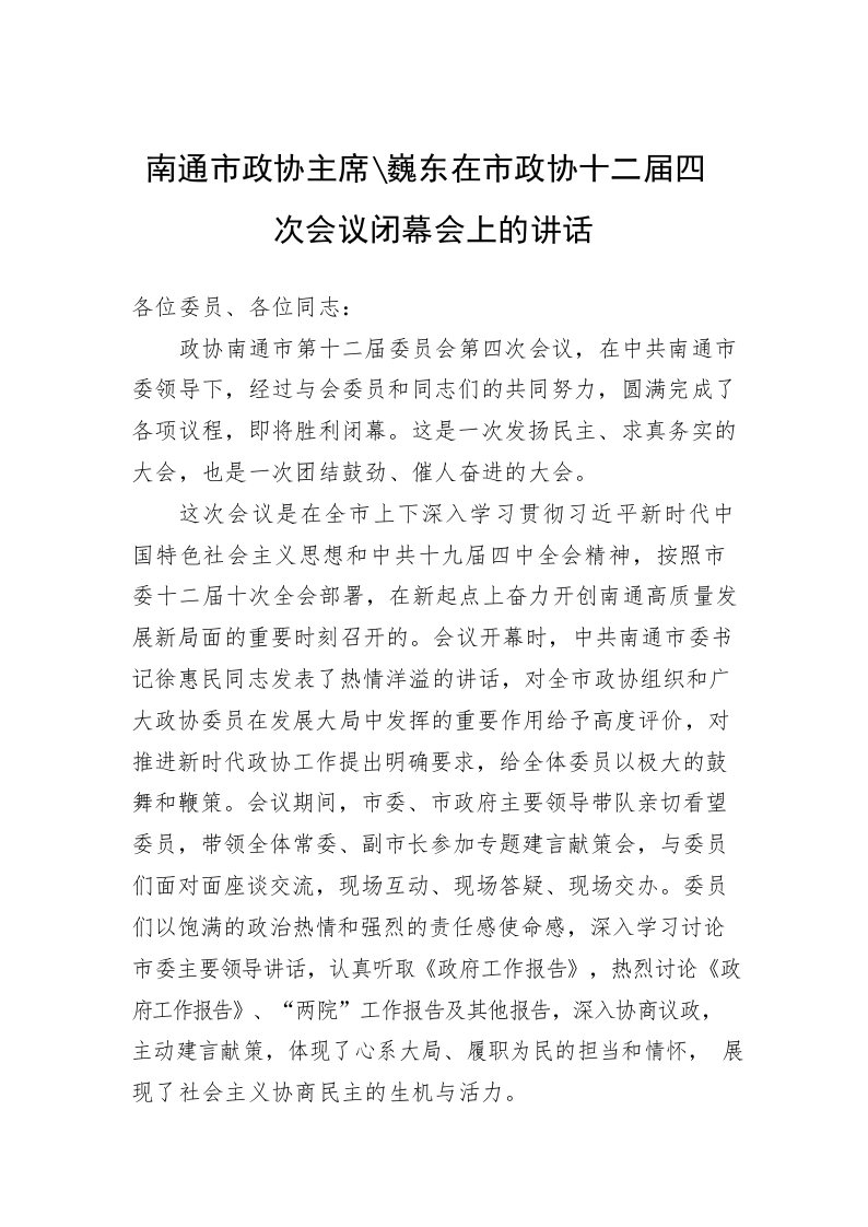 / 南通市政协主席黄巍东在市政协十二届四次会议闭幕会上的讲话