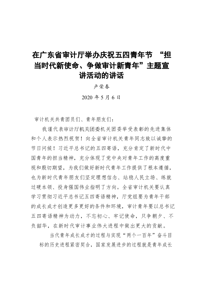 / 卢荣春在广东省审计厅举办庆祝五四青年节 “担当时代新使命、争做审计新青年”主题宣讲活动的讲话(20200506)